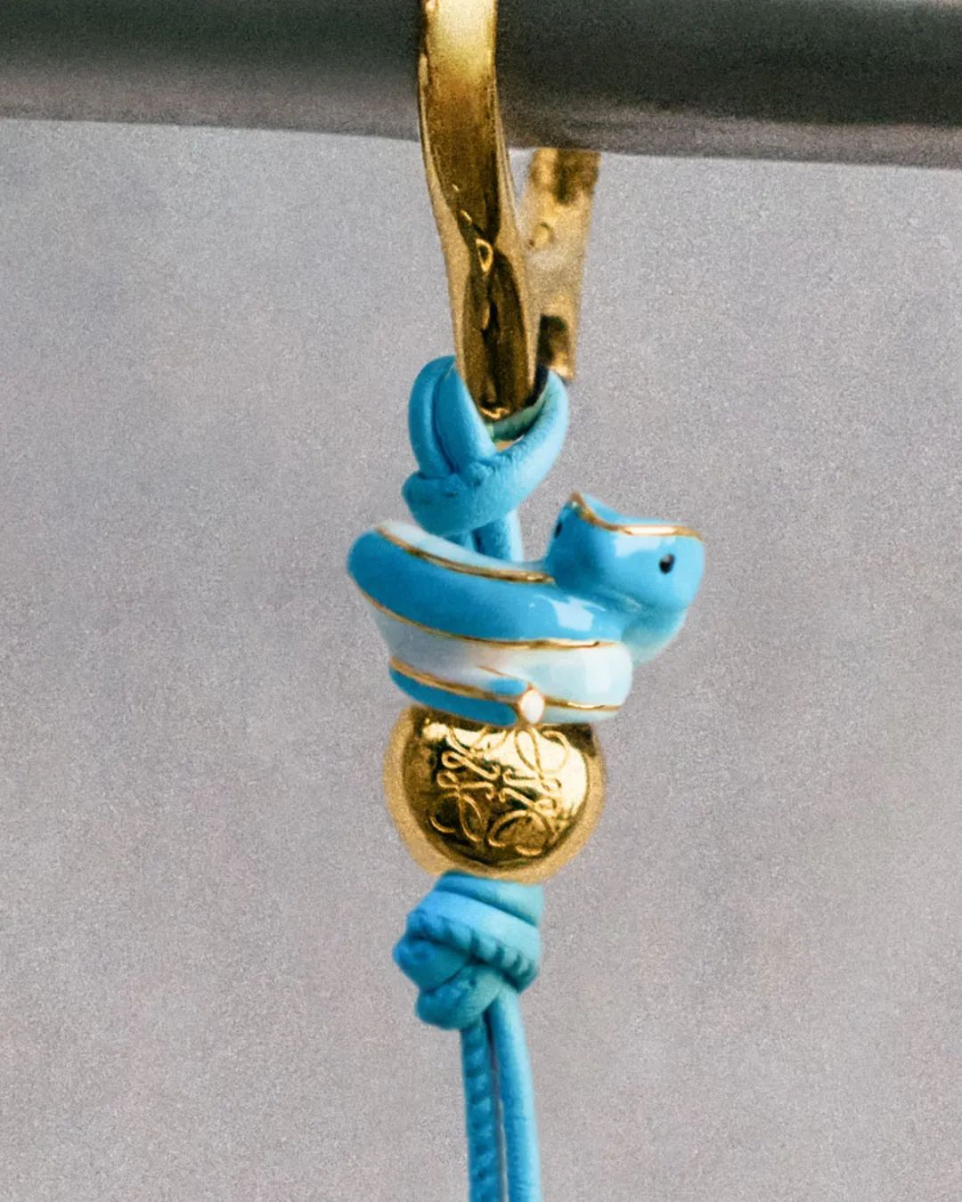 迎接蛇年吉意,LOEWE罗意威与中国工艺美术大师、熊氏珐琅第三代传人熊松涛合作,打造两组中国景泰蓝特别作品:配有蛇头与莲花景泰蓝装饰的Nest手袋;以及景泰蓝吉祥挂坠,有青蛇、灵猴和祥云三款图案可供选择。景泰蓝元素亦化为成衣、鞋履、配饰和一系列特别版手袋的灵感。新款手拿包采用了祥云或盘蛇造型,而标志性Puzzle手袋和Pebble水桶包则采用了3D视觉效果的云朵图案以及蛇形链饰进行装饰,令包面造型栩栩如生。