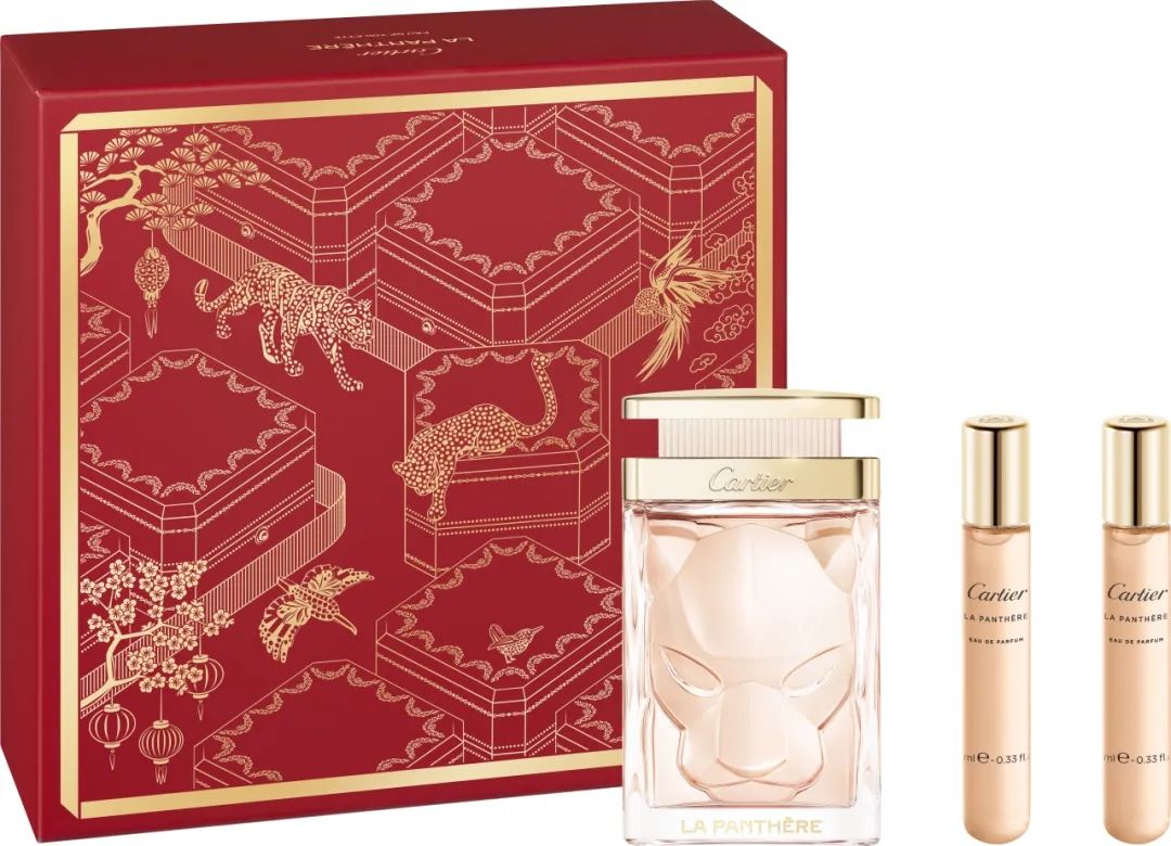 卡地亚La Panthère猎豹香水特别推出新年限定套装。在卡地亚原有礼盒设计基础上全新融入梅花、灯笼、竹子、祥云等中国文化元素。套装包含La Panthère猎豹系列100毫升淡香水和两支10毫升便携式喷雾,分别为同系列的淡香水和香水。