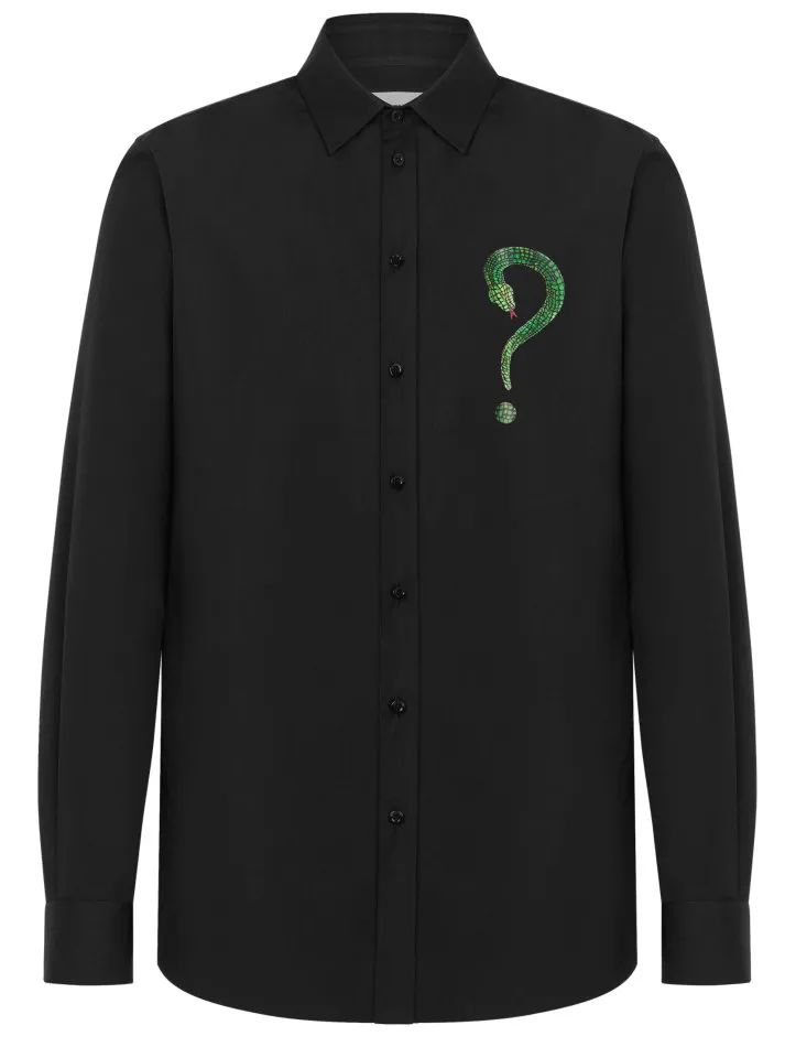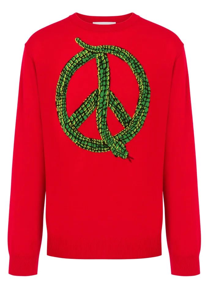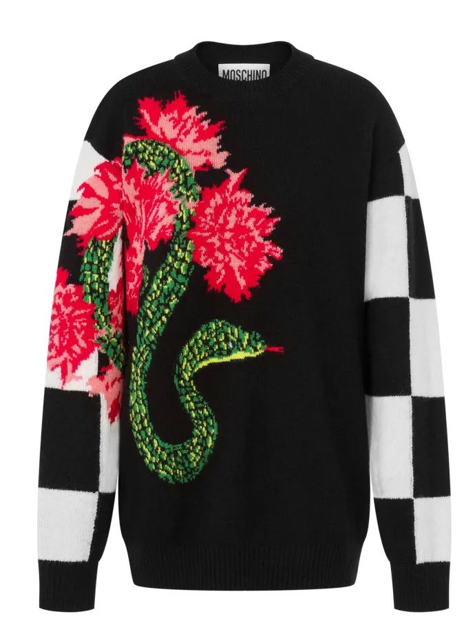 Moschino 2025农历新年限量系列,创意总监 Adrian Appiolaza 从Franco Moschino在80年代末创作的一幅画中汲取灵感,画中一条立体的蛇环绕着画框里——他将其重新诠释并融入Moschino的经典符号,以致敬这一节庆时刻。品牌标志性元素与蛇的元素融合,赋予和平符号与问号全新诠释。同时,特别设计的定制标签将蛇与康乃馨结合,这一花卉图案也展现在2025年早春女装系列中。