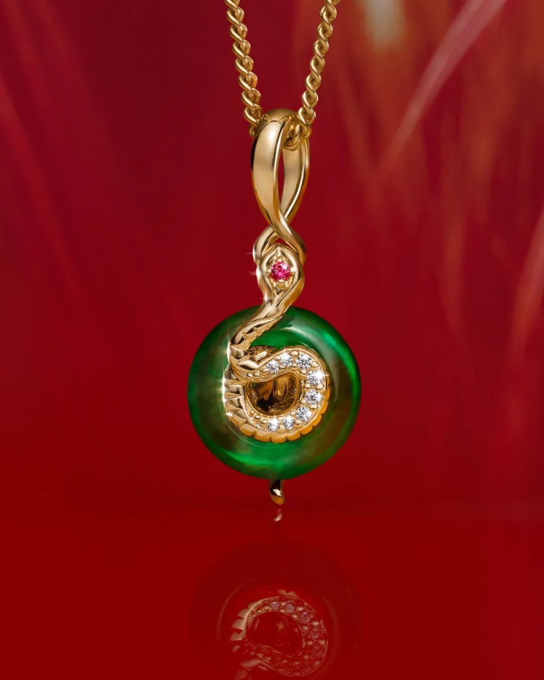 全新2025新年系列以盘绕的灵蛇与浓郁新年红为主要元素,将灵蛇幻化为精巧配饰:金蛇链扣蛇骨手链将品牌经典蛇骨链与全新金蛇链扣相结合,寓意去故纳新、拥抱新生;蛇来运转吊饰以古代护身符为灵感,金色灵蛇盘绕于玉石绿色圆环之上,象征财富、健康与和谐;而小金蛇串饰则勾勒出灵蛇蜿蜒盘绕的形态,精致镶嵌工艺赋予其绝佳纹理质感,传递温暖守护与满满福气。