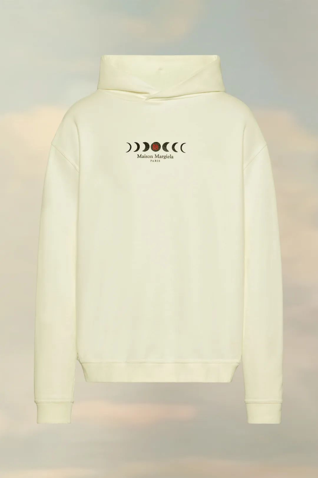 系列包含三款单品——连帽卫衣、T恤和印花丝巾。连帽卫衣和T恤采用“朔望纪新”主题印花, 于满月中装饰“蛇”字刺绣纹样;丝巾则以传统棋盘游戏“蛇与梯子”为灵感:在月相环绕中,蜿蜒的蛇乘梯而上,赋予新一年步步高升的美好憧憬与期待。